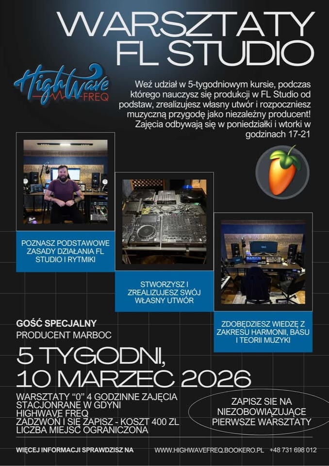10 marca o godzinie 17:00 otwieramy w Highwave Freq w Gdyni coś, na co czekaliśmy od dawna. Ruszają nasze pierwsze warsztaty produkcji muzyki w FL Studio.Zanim jednak wystartuje pełny, 5-tygodniowy kurs, zapraszamy na coś wyjątkowego – Warsztaty 0.To czterogodzinne spotkanie, które pozwoli Ci wejść do naszego świata bez zobowiązań. Przyjdziesz, zobaczysz jak pracujemy, poznasz prowadzących, usiądziesz przy stanowiskach i poczujesz atmosferę prawdziwego studia. Pokażemy, jak wygląda budowanie rytmu, jak konstruować pierwsze elementy utworu i jak FL Studio może stać się Twoim narzędziem do tworzenia własnej muzyki.To nie jest wykład. To nie jest prezentacja slajdów. To spotkanie z realną produkcją – z pytaniami, rozmową i konkretną pracą na projekcie.Warsztaty poprowadzą Kamil Zarębski (Ricoo), który na co dzień pracuje w FL Studio, oraz Marcin Bociański (Marboc) współzałożyciel Highwave Freq i producent prowadzący kursy Ableton Live. Dzięki temu masz dwie perspektywy, dwa doświadczenia i pełne wsparcie podczas zajęć.Warsztaty 0 są płatne (400 zł), ale nie zobowiązują do wykupienia całego kursu. Chcemy, żeby decyzja o dalszej nauce była świadoma. Najpierw poznaj nas, zobacz jak pracujemy, sprawdź czy to klimat dla Ciebie. Jeśli poczujesz, że to Twoje miejsce – będziemy kontynuować wspólną drogę.Zajęcia odbywają się w naszym studiu w Gdyni w godzinach 17:00–21:00. Liczba miejsc jest ograniczona, bo zależy nam na realnym kontakcie i komforcie pracy.Zapisać się można przez naszą stronę w zakładce „Karnety” (Warsztaty 0 – FL Studio) lub telefonicznie. Po zakupie otrzymasz potwierdzenie mailowe, a my widzimy Twoje zgłoszenie w systemie wszystko jest proste i przejrzyste.Jeśli myślisz o produkcji muzyki, ale nie wiesz od czego zacząć, albo chcesz uporządkować wiedzę i wejść na wyższy poziom to może być dobry moment.